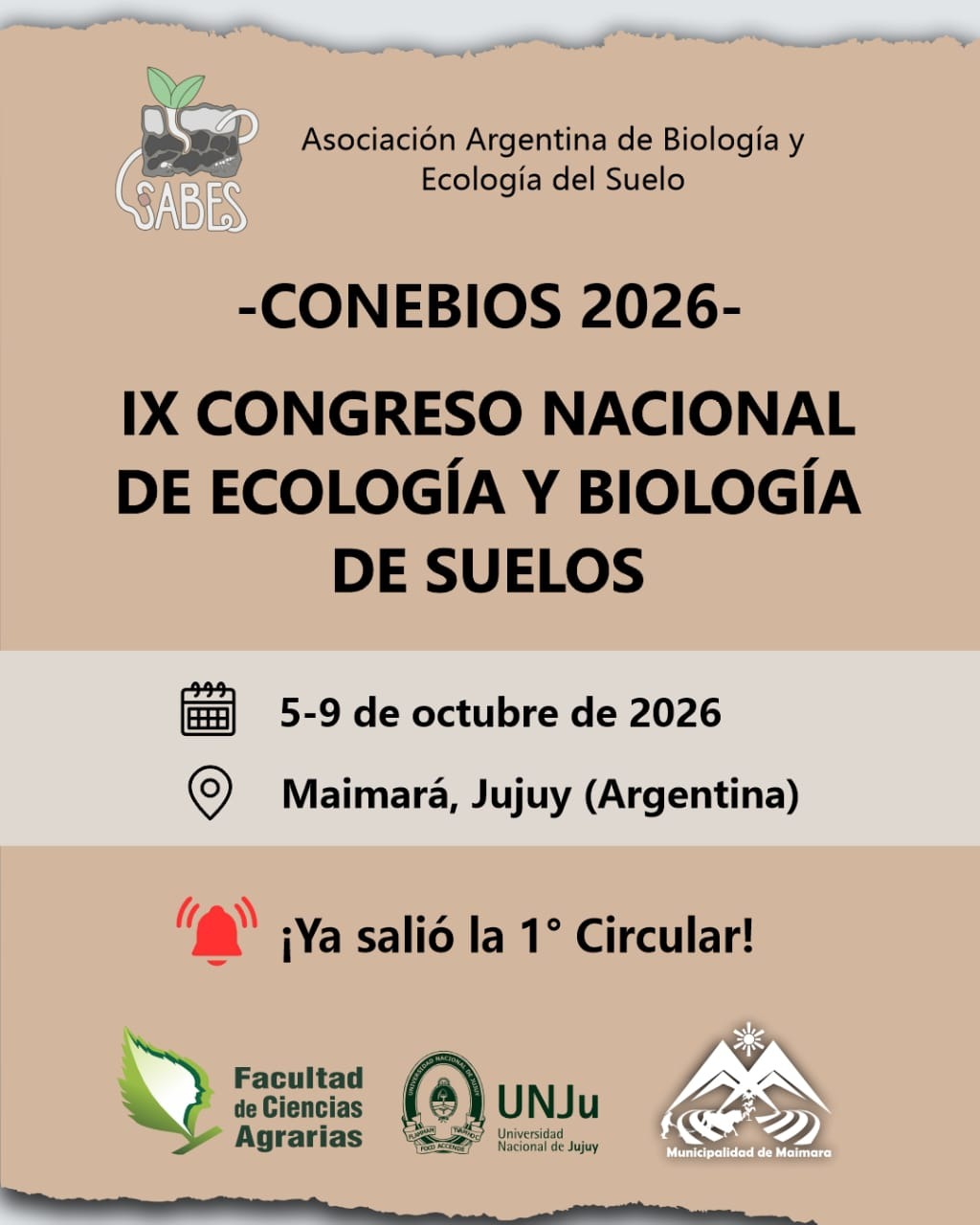 Estimadas y estimados colegas, nos es grato anunciarles que estamos organizando el 9° Congreso de Ecología y Biología de Suelos (IX CONEBIOS), que se realizará en la Ciudad de Maimará, Jujuy, del 5 al 9 de octubre del 2026.